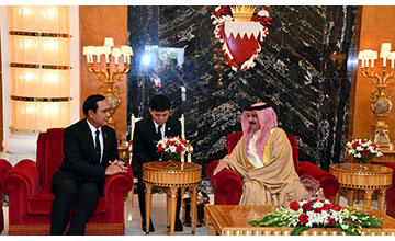 Manama, Apr.25(BNA): His Majesty King Hamad bin Isa Al-Khalifa today received, at Al-Sakhir Palace, Thai Prime Minister General Prayut Chan-o-cha, currently on an official visit to the Kingdom of Bahrain. His Royal Highness Prime Minister Prince Khalifa bin Salman Al-Khalifa and His Royal Highness Prince Salman bin Hamad Al-Khalifa, Crown Prince, Deputy Supreme Commander and First Deputy Premier attended. Premier Chan-o-cha conveyed to HM the King greetings from Thai King Maha Vajiralongkorn and his wishes to the people of Bahrain of further progress and prosperity. HM the King also extended greetings to the Thai monarch, wishing his friendly people further progress and prosperity. He commended the Thai Premier's visit which, he said, would represent a fresh start to strengthen solid bilateral relations, hailing his dedicated efforts to strengthen joint cooperation. The King and the Premier reviewed ways of expanding economic, trade, investment, cultural and tourism cooperation, under the joint agreements and memoranda of understanding. He reiterated Bahrain's keenness on bolstering growing relations, looking forward to strengthening cooperation, expanding public-private partnership and exchanging expertise to develop all sectors. The two leaders affirmed joint keenness on expanding trade and investment cooperation and benefiting from expertise to support joint projects and programmes, whose windfall will benefit on both friendly peoples. HM the King stressed the importance of exchanging high-level visits between officials and businessmen to enhance joint cooperation towards achieving both countries' aspirations. He underscored the importance on boosting the volume of trade exchanges and developing relations between the Gulf Cooperation Council (GCC) countries and the Association of Southeast Asian Nations (ASEAN) states, particularly political, economic, investment and cultural ties. He underlined the common denominators between the GCC and ASEAN group, which belong to two strategic regions for international trade and global economy. HM the King commended Thai economic and tourism strides and positive role in Asia, lauding the contributions of the Thai expatriate community to Bahrain's development and progress. Support to regional and international efforts to maintain security and stability in the region and the world was also stressed. The Thai Premier expressed thanks to HM the King for the warm welcome and genuine hospitality, hailing the care the Thai community finds in Bahrain. He paid tribute to HM the King, hailing his keenness on strengthening bilateral relations on all levels. He reiterated his country's keenness on expanding cooperation towards achieving mutual interests in all fields, lauding Bahrain's economic strides.