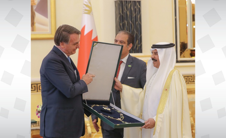 Manama, Nov. 16 (BNA): His Majesty King Hamad bin Isa Al Khalifa received at Gudaibiyah Palace today President of the Federative Republic of Brazil, Jair Bolsonaro. After holding the official reception protocols, the Brazilian President greeted members of the Bahraini side and HM the King greeted the accompanying delegation of the Brazilian President. Then, HM the King held a discussion session with the Brazilian President during which they reviewed relations and cooperation between the two friendly countries and ways of bolstering them. The Brazilian President thanked HM the King for the gracious welcome and hospitality and for his keenness to enhance bilateral relations. After that, HM the King held an extended discussion session in the presence of the Bahraini and Brazilian sides. In a speech delivered on the occasion, HM the King welcomed the Brazilian President and his accompanying delegation, praising growing relations of friendship between the two countries. He described the visit as a step forward to promote bilateral relations and cooperation, congratulating the Brazilian President on patronizing the opening the Brazilian embassy in Manama. “We look forward, in turn, to the official opening of the embassy of the Kingdom of Bahrain in Brasilia soon as this will have a great impact on boosting out diplomatic relations and common interests,” HM the King said. HM the King hailed the Brazilian President’s ratification of the air services agreement between both countries. He also stressed that the signing of a number of memoranda of understanding and agreements reflects common keenness to foster bilateral cooperation in various fields. HM the King reiterated thanks and appreciation to the Brazilian President for patronizing a celebration held by the King Hamad Global Centre for Peaceful Coexistence to inaugurate the Declaration of Bahrain in South America. “This confirms what we agree on about the need to continue spreading the values of tolerance, coexistence and enlightened thought to promote harmony and peace for the good of all mankind,” HM affirmed. HM the King bestowed on the Brazilian President the Order of Shaikh Isa bin Salman Al Khalifa, the highest decoration in the Kingdom of Bahrain, in tribute for his efforts to strengthen bilateral relations and cooperation. The President of the Federative Republic of Brazil gave a speech in which he expressed happiness about visiting Bahrain and meeting HM the King for the first time. He thanked HM the King and the Bahraini people for the gracious welcome he received with his accompanying delegation. He described his visit to the kingdom as a new page in relations between both countries. He also invited HM the King to visit Brazil, stressing the importance of continuous dialogue in further cementing relations and benefiting from the available opportunities. “Today, we are taking an important step towards a deeper relationship: The opening of the Brazilian embassy in Manama, a major sign of Brazil's intent to establish solid relations with Bahrain,” he said. “I do also feel grateful for HM the King’s wise initiative to open Bahrain’s embassy in Brasilia in 2018,” he added, underlining the importance of this step in promoting rapprochement and developing partnership that goes beyond political dialogue. He also pointed out growing economic cooperation between both countries, expressing keenness on boosting investments. He also noted that the signing of a cooperation agreement in the defence field will further deepen bilateral relations in the region. “Brazil has a reliable, diversified and advanced industrial defence base, ready to meet Bahraini needs,” the Brazilian President said, stressing common keenness to promote peace and stability in the region and the world. He also commended Bahrain’s efforts to foster religious tolerance and peaceful coexistence. The Brazilian President conferred on HM the King the Grand Collar of the Brazilian National Medal of the Southern Cross, the highest decoration in Brazil, in tribute for HM’s role and efforts to consolidate relations between the two friendly countries. HM the King bestowed the Order of Bahrain-First Class on the Brazilian President’s wife. HM the King also bestowed the “Order of Bahrain” on national team player Ali Munfaridi for winning gold in the World jiu-jitsu Championship which was organised by the Jiu-Jitsu International Federation in Abu Dhabi, the UAE. He also bestowed the Order of Competence on Shaikh Mohammed bin Saud bin Salman Al Khalifa, Ahmed Abdulhamid Ali Al Aradi, Bader Jamal Jassim Mohammed Namshan Al Dosari, Soghra Abdelrazaq Ismail Mubarak and Hassan Makki Mahdi Ali Abdullah. HM the King and the Brazilian President presented the players with the medals in appreciation of their efforts to clinch gold. His Highness Shaikh Nasser bin Hamad Al Khalifa presented the Brazilian President with a commemorative gift. A number of agreements and memoranda of understanding have been signed in the presence of HM the King and the Brazilian President. They are: 1- An agreement on mutual exemption from visa requirements for holders of diplomatic, special and official passports. It was concluded by Minister of Foreign Affairs HE Dr. Abdellatif bin Rashid Al Zayani and his Brazilian counterpart Carlos Alberto Franco Franca. 2- A memorandum of understanding between Mohammed bin Mubarak Al Khalifa Academy for Diplomatic Studies and the Rio Branco Institute of the Ministry of Foreign Affairs of the Federative Republic of Brazil. It aims to boost cooperation in training diplomats and exchanging information and expertise. It was concluded by the Foreign Ministers of both countries. 3- A memorandum of understanding on cooperation in the sport field. It was concluded by the Foreign Ministers of both countries. 4- A memorandum of understanding between Bahrain Authority for Culture and Antiquities (BACA) and the Brazilian Ministry of Tourism to boost cultura