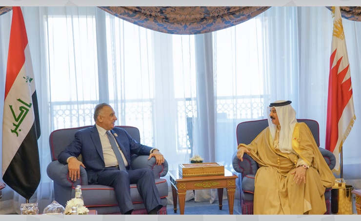 HM the King and Prime Minister Al-Kadhimi reviewed the solid brotherly relations between Bahrain and Iraq, in addition to ways to bolster cooperation between them at all levels.