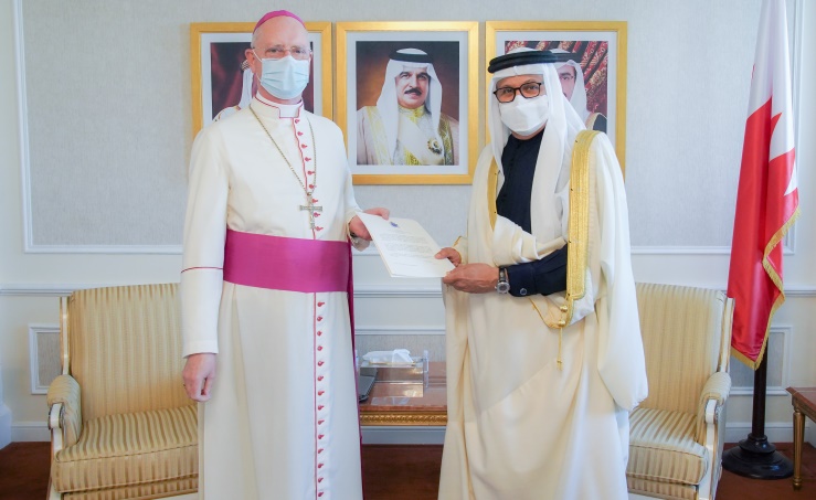 The message was handed over to the Minister of Foreign Affairs, Dr. Abdullatif bin Rashid Al-Zayani, today when he received Ambassador-designate of the Vatican to Bahrain, Archbishop Eugene Martin Nugent.