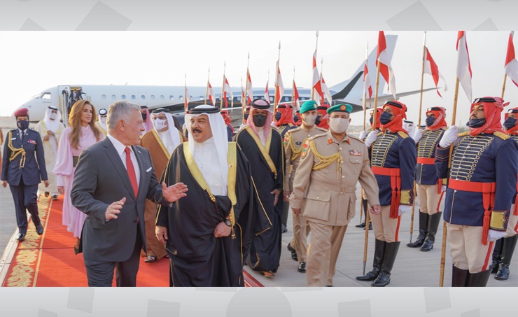 Manama, Nov. 22 (BNA): His Majesty King Hamad bin Isa Al Khalifa today welcomed His Majesty King Abdullah II Ibn Al Hussein of Jordan, who was accompanied by Her Majesty Queen Rania Al Abdullah, upon arrival at the Sakhir Airbase on a visit to the kingdom.