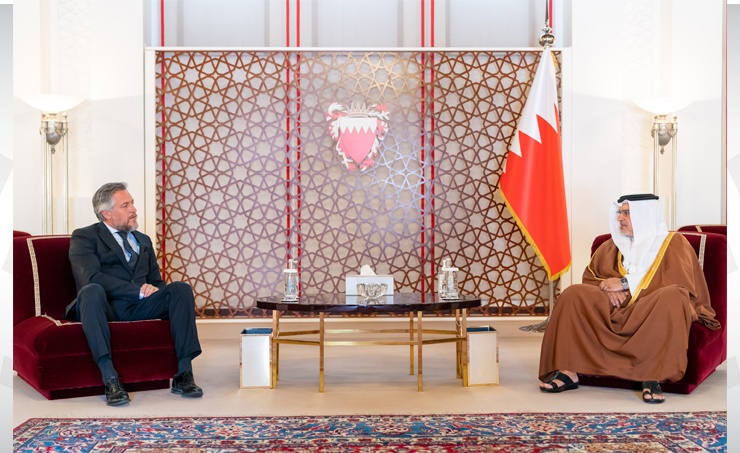Manama, June 1 (BNA): His Royal Highness Prince Salman bin Hamad Al Khalifa, the Crown Prince and Prime Minister, today met with the European Union's Ambassador to the Kingdom of Bahrain, His Excellency Patrick Simonnet, at Riffa Palace. His Royal Highness highlighted the Kingdom’s commitment to further strengthen international opportunities for cooperation in support of wide-ranging development goals, and in line with the Kingdom's commitment to comprehensive development led by His Majesty King Hamad bin Isa Al Khalifa. His Royal Highness emphasised the importance of continuing to strengthen relations with EU member states and expressed Bahrain's commitment to furthering strategic partnerships and increasing EU cooperation, in particular economic, investment, climate change, and security cooperation. HRH the Crown Prince and Prime Minister noted that difficult global challenges have shown that nations must work together in a spirit and culture of cooperation and dialogue, to achieve progress whilst maintaining peace, security and stability. Regional and international issues of common interest were discussed. His Highness Shaikh Mohammed bin Salman bin Hamad Al Khalifa also attended the meeting.
