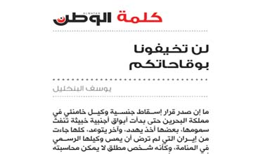 Manama, June 22 (BNA): Al Watan newspaper has quashed the "vile, cheeky statements oozing from suspicious persons and organisations, following the Kingdom's decision of denaturalizing Khamenei's agent in Bahrain".
