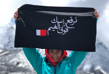 Juwan Abdulkhaleq, an eighth grade student, held high the flag of Bahrain with the message “I raise you above the clouds” as she made history by reaching the South Base Camp in Nepal at an altitude of 5,364 metres.