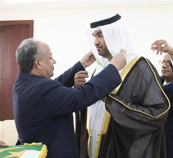 Abu Dhabi, April 21, 2013 (WAM) - Moulaye Ould Mohamed Laghdaf, the Prime Minister of Mauritania, presented Dr. Sultan Ahmed Al Jaber, CEO of Masdar, with Mauritania's Order of National Merit Medal.