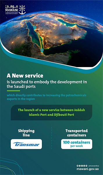 Riyadh, December 22, 2021, SPA -- The Saudi Ports Authority (MAWANI) has announced a new direct shipping service connecting Saudi Arabia to Djibouti, through leading container transport company, Transmar, in an important development that serves to leverage the significant potential of the Kingdom's ports, bolster its petrochemicals exports and transshipments, and further expand its maritime network around the globe.