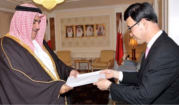 Manama, Mar. 13 (BNA): Minister of Foreign Affairs, Shaikh Khalid bin Ahmed bin Mohammed Al Khalifa, received at his office at the Ministry's General Court today, Hideki Ito, who presented to him a copy of his credentials as Ambassador-Designate of Japan to the Kingdom of Bahrain.