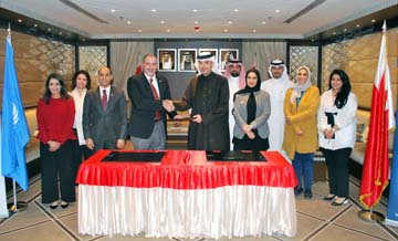 Manama, Jan. 16 (BNA): Youth and Sport Affairs Minister Hisham Mohammed Al Jowder and UN Resident Coordinator/ UNDP Resident Representative Amin Al Sharkawi have signed a project document to implement the King Hamad Youth Empowerment Award to achieve the Sustainable Development Goals (SDGs). The King Hamad Youth Empowerment Award is the first of its kind in the region, aimed at strengthening the efforts of the ministries of the Kingdom with various organizations and bodies affiliated to the United Nations. The signing of the agreement between the Ministry of Youth and Sport Affairs and the United Nations Development Programme comes within the framework of the strategic partnership between the Kingdom of Bahrain and the United Nations (2018 – 2022). This initiative supports progress already made towards the realization of the SDGS, as through this award all participating categories focus upon one or more of the 17 goals. Al Jowder expressed the importance of signing the agreement with the UNDP as progress towards implementing the framework of the strategic partnership between the Kingdom of Bahrain and the United Nations, especially related to youth. The project document aims to coordinate the continuous and growing cooperation between UNDP and the ministry, reflecting the joint effort to promote the implementation of the Sustainable Development Goals through programmes and initiatives targeting youth, according to the minister. The minister said: "Among the joint programmes of cooperation between the Ministry of Youth and Sport Affairs and the United Nations Development Programme is the King Hamad Youth Empowerment award to achieve the global SDGs, which is one of the most important international awards to urge the world, governmental and private bodies to empower youth and support young minds. The Award attracts participants interested in creative innovations to achieve the Sustainable Development Goals, in addition to uniting global efforts on a single platform. The King Hamad Youth Empowerment Award to achieve the SDGs embodies noble goals towards youth and the future of the whole world." The minister reiterated his support of the mutual cooperation: "We are confident that cooperation with the United Nations Development Programme (UNDP) will contribute to supporting the efforts of the Kingdom of Bahrain to provide youth globally with real opportunities to implement their innovations to achieve the Sustainable Development Goals." El Sharkawi praised the efforts of the Ministry of Youth and Sport Affairs in integrating the Sustainable Development Goals (SDGs) into its programmes, highlighting the Government of Bahrain’s determination in achieving the SDGs by 2030. "The King Hamad Youth Empowerment Award to achieve the SDGs raises awareness on the SDGs, while promoting various ways to achieve them. It also supports innovation and sends a message of "Act good." The Award’s target audience is youth, of which there are currently 1.8 billion youth between the ages of 10-24, more than ever before. This is truly significant, as we not only aim to improve the world for future generations, but engage them in the development process to help create the world they want to see." The UNDP resident representative added that the private sector, NGOs and government institutions all play an important role in supporting youth towards the achievement of the goals: "We in the UN in Bahrain hope that the King Hamad Youth Empowerment Award to achieve the SDGs will encourage young minds and thinkers to innovate and work towards doing good for their communities and beyond." El Sharkawi also highlighted the significance of and the long partnership between the United Nations in Bahrain and the Government of Bahrain, which youth have frequently been at the heart of. "Today’s signature builds on the recent signed Strategic Partnership Framework between the United Nations and the Government of Bahrain to support Bahrain in achieving its development objectives and the SDGs in the spirit of the Bahrain Vision 2030 and the Government Action Plan." "Jurors, suggested by UNDP, came from different countries, and were efficient in soliciting applications for the award. This award is unique in that it is universal, objective and sustainable, and therefore, we at UNDP have ensured that the selection criteria is objective, impartial and transparent," El Sharkawi said. The signing of the agreement was attended by the joint working team between the Ministry of Youth and Sports Affairs and the United Nations Development Programme and representatives from the Ministry of Foreign affairs.