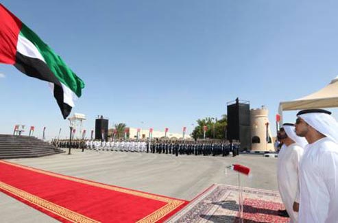 Sheikh Mohammed added, "Forty years ago, Sheikh Zayed and Sheikh Rashid hoisted the flag and we followed them and, today, you and members of the U.A.E. Armed Forces officers are hoisting the flag high to safeguard the country's pride and gains." He also urged them to train seriously, and obey trainers and military commanders to defend the homeland, people and national achievements, side by side with the U.A.E. Armed Forces.