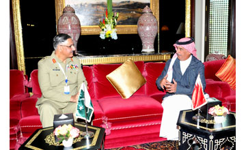 Manama, Dec. 9 (BNA): National Guard Chief Lt. General Shaikh Mohammed bin Isa Al Khalifa met the Pakistani Chairman of the Joint Chiefs of Staff Gen. Zubair Mahmood Hayat, on the sidelines of Manama Dialogue 2017. The National Guard Chief stressed the deep-rooted relations between Bahrain and Pakistan and lauded Pakistan’s constant support to Bahrain in its continuous security and military efforts against foreign interference and terrorism. He also underlined Bahrain’s keenness on more cooperation with Pakistan in the defence field. Gen. Zubair Mahmood Hayat praised the advanced relations between both countries and growing cooperation in various fields. He also expressed keenness of the Pakistani army to boost cooperation with the National Guard and the military institutions in Bahrain. The two sides discussed issues of common interest.
