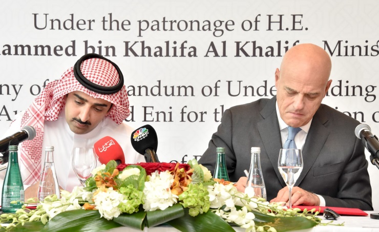 Manama, (BNA): A Memorandum of Understanding (MoU) has been signed between the National Oil and Gas Authority of the Kingdom of Bahrain (NOGA) and Enito on pursuing petroleum exploration of Block 1, an offshore area of over 2,800km2, situated in the northern territorial water of the Kingdom of Bahrain with a depth ranging from 10 m up to 70 m. The memo was concluded by Shaikh Mohammed bin Khalifa AlKhalifa, Minister of Oil and Eni’s Chief Executive Claudio Descalzi, in the presence of a number of officials from NOGA, the oil and gas holding company (noga holding), Tatweer Petroleum – Bahrain Field Development Company and a number of executives from the oil and gas industry. Shaikh Mohammed praised the wise leadership, led by His Majesty King Hamad bin Isa Al Khalifa, and the prominent role played by the Higher Committee for Natural Wealth and Economic Security, chaired by His Royal Highness Prince Salman bin Hamad Al Khalifa, Crown Prince, Deputy Supreme Commander and First Deputy Prime Minister, which aims to preserve the country’s natural wealth, develop energy sources and support the national economy. He said that the strategic partnership with Eni is a major positive step towards utilizing the Kingdom’s offshore natural resources and that with this signing, the aim is to hold various discussions to review all relevant aspects of the technical and commercial terms of the potential exploration and development within a reduced timeframe. Descalzi hailed the MoU and the opportunity to explore the potential of Block 1 which will allow Eni to start cooperating and investing in a country that was one of the first in the Gulf to produce oil and which now aims at unveiling its offshore potential. Entering in Bahrain will enable Eni to expand its presence in a key region of the Middle East, in line with Eni’s strategy aimed at diversifying Eni’s exploration portfolio across basins with liquid hydrocarbon potential while keeping high quality stakes throughout the exploration phase.