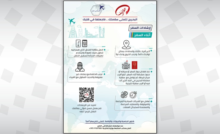 The activities of the initiative cover all the Kingdom's ports, along with e-awareness to reach out to the most significant number of citizens who are travelling aboard during summer vacation. The initiative aims to protect the Bahrain identity, social values and loyalty to the nation. The safety travelling awareness includes writing correct details while applying for visas, checking the validity of the passports and keeping hard and soft copies of essential documents.