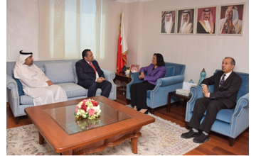 Manama, June 5 (BNA): Health Minister Faeqa bint Said Al Saleh received Bahrain Society for Sickle Cell Anaemia Patient Care Chairman Zakareya Ebrahim Al-Kadhem and his accompanying delegation, in the presence of Assistant Undersecretary for Hospital Affairs Dr. Mohammed Amine Al Awadhi.