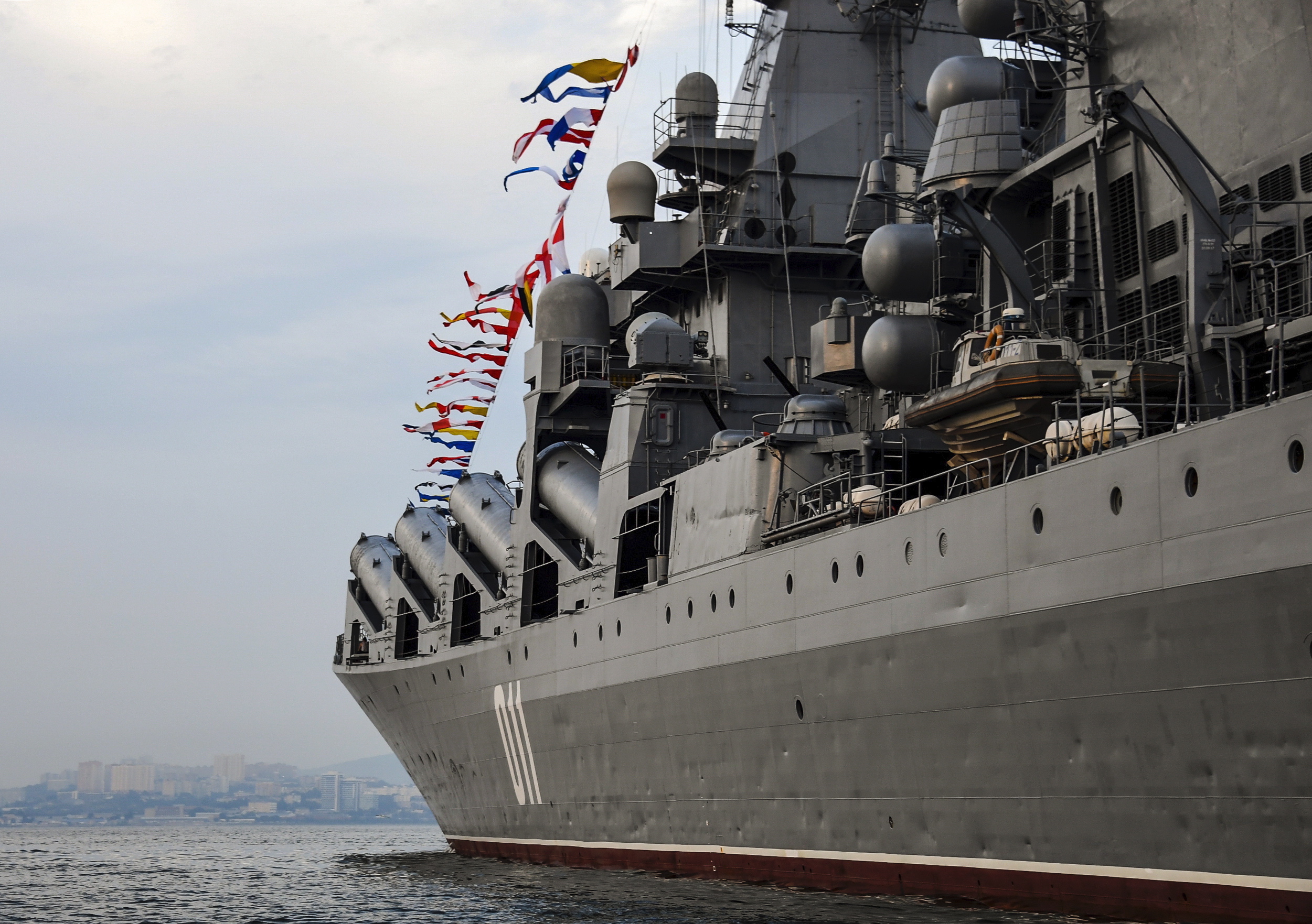 The Varyag missile cruiser belongs to the Project 1164 class. The main armament of the cruiser comprises 16 anti-ship missiles of the P-1000 Vulkan complex with a range of at least 700 kilometers. The cruiser is protected from enemy planes, helicopters and missiles by the S-300F Fort and Osa-M anti-aircraft systems, as well as AK-630 caliber 30 mm six-barreled artillery mounts. The ships are equipped with two five-tube 533-mm caliber torpedo launchers, two rocket-propelled bomb launchers designed to fight enemy submarines, and a helicopter. The arsenal also contains an AK-130 artillery launcher with 130-mm caliber rapid-firing guns, the firing range is 23 km.