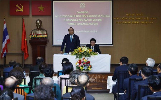Bangkok, June 24 (VNA) – Prime Minister Nguyen Xuan Phuc on June 23 visited the Vietnamese Embassy in Thailand and talked with its staff and representatives of the Vietnamese community on the occasion of his attendance at the 34th ASEAN Summit. Vietnamese Ambassador to Thailand Nguyen Hai Bang reported to the PM that the relations between Vietnam and Thailand are developing well in various fields. Two-way trade is likely to reach 20 billion USD in 2020, he said. The diplomat said Vietnamese people in Thailand always trust in the Vietnamese Party and State’s policies and they are serving as a bridge to connect the two countries. Trinh Cao Son, chairman of the association of Vietnamese-Thai people, pledged to spare no efforts to build a strong Vietnamese community, preserve national cultural identities, and increase mutual understanding and friendship between the Vietnamese and Thai people. After listening to the aspirations of overseas Vietnamese in Thailand, PM Phuc informed them the country’s remarkable achievements in economy and politics. While evaluating the relations between Vietnam and Thailand, he said the two countries are enjoying the best relationship in their history, adding that the rapport between the two PMs is deeply close. PM Phuc said in his bilateral meeting with Thai counterpart Prayut Chan-o-cha on the sidelines of the 34th ASEAN Summit, the two countries’ proposals were all taken in account and they agreed to hold the joint cabinet meeting at the year-end. He asked the Vietnamese community to continue supporting one another in preserving their cultural traditions, particularly the Vietnamese language and script. The Government leader encouraged them to facilitate their younger generations in studying to become researchers and scientists in a developed society. He stressed that each Vietnamese should become a bridge attracting Thai tourists and investors to Vietnam and bringing Vietnamese goods to Thailand. In the afternoon of the same day, PM Phuc and his entourage left Bangkok, concluding his trip to attend the 34th ASEAN Summit.-VNA