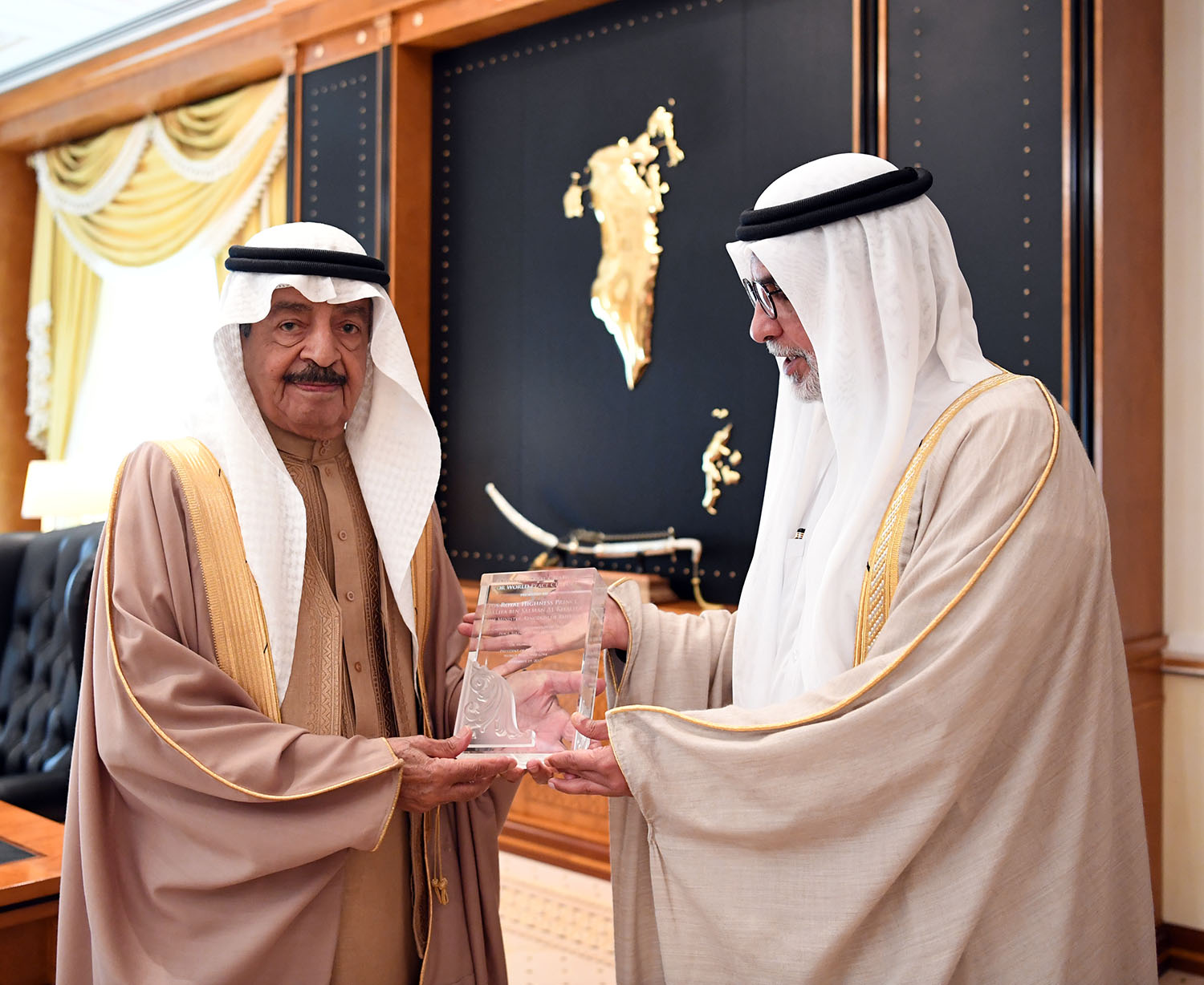 Manama, Sep. 26 (BNA): His Royal Highness Prime Minister Prince Khalifa bin Salman Al Khalifa was presented today with the Shield of the Federation of World Peace and Love (FOWPAL), the International Peace Culture Document and the International Peace Union Declaration in regards to promoting peace as a global culture. This came during a meeting at Gudhaibiya Palace today with Shaikh Hussam bin Isa Al Khalifa.