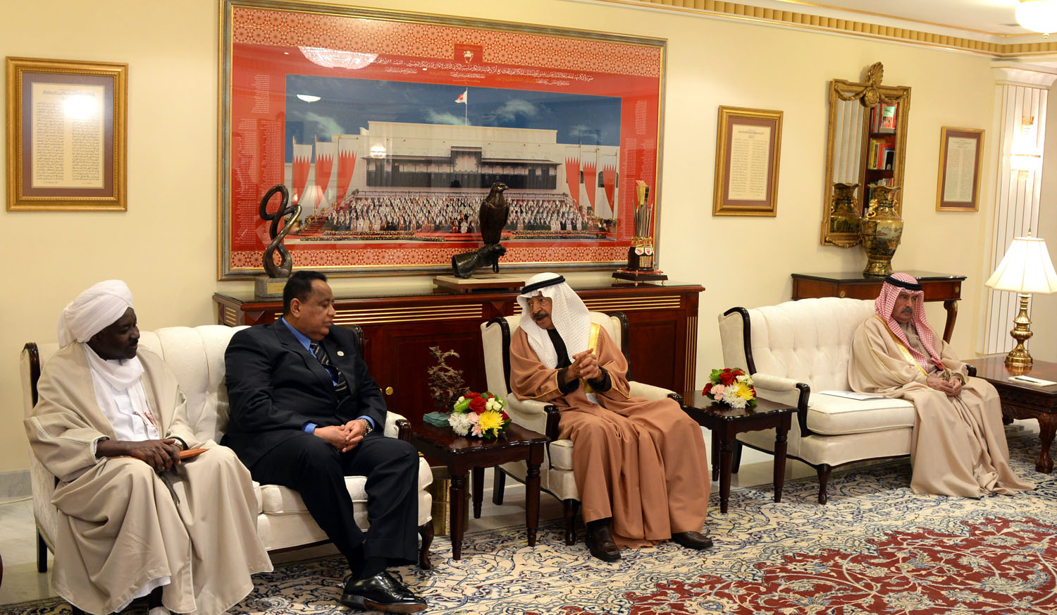 HRH the Premier described the Arab union as people’s utmost aspiration to foster peace and stability. He praised strong fraternal relations between Bahrain and Sudan and growing bilateral cooperation regarding regional and international challenges. He also stressed Bahrain’s keenness to further cement ties between both countries and avail of the opportunities offered by Sudan mainly in the agricultural and livestock field.