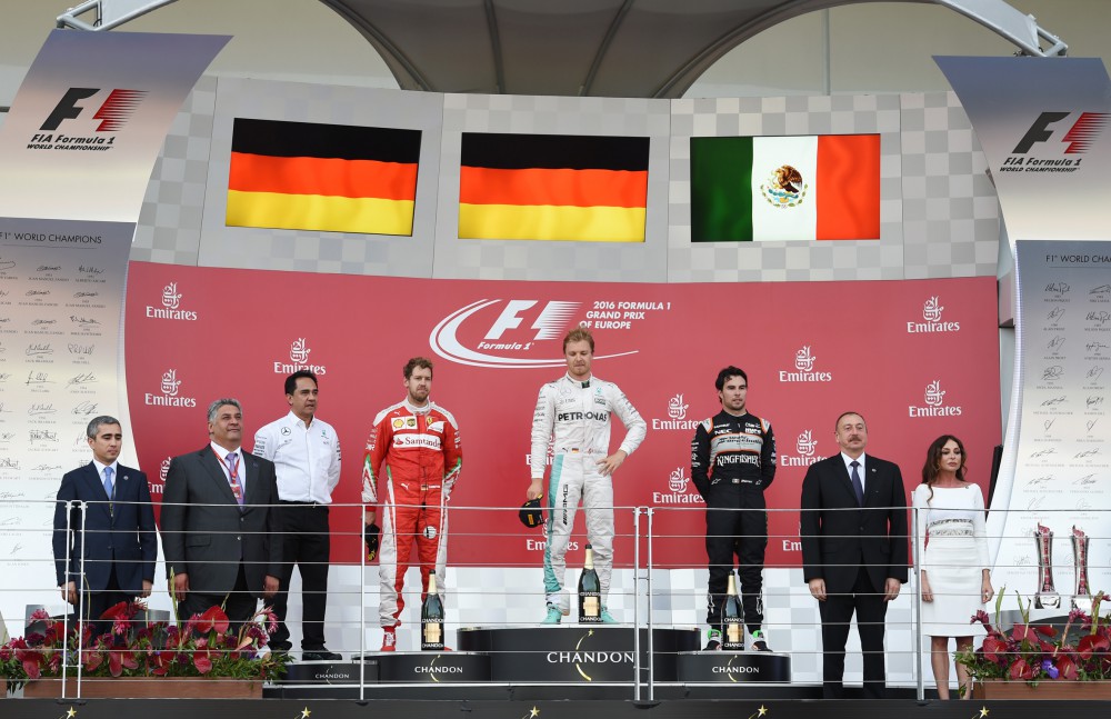 Azerbaijan’s President Ilham Aliyev presented the first place trophy to Nico Rosberg from Mercedes AMG F1 team.