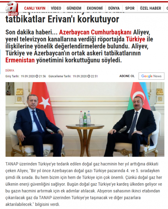 Baku, September 22, AZERTAC A number of foreign media outlets have widely covered President Ilham Aliyev`s interview with Azerbaijan Television, Public Television and Real Television following the groundbreaking ceremony of the offshore operations of the Absheron field at the Heydar Aliyev Baku Deep Water Jackets Plant. The foreign media primarily drew the audience's attention to the Azerbaijani President's statements on the heinous policy of the Armenian leadership and its provocations. Turkish Anadolu Agency, Hurriyet, Milliyet, Sabah, Takvim and other popular newspapers, TRT HABER, TGRT, HABER TURK, A HABER, NTV TV channels, Russia's TASS, Interfax and RIA Novosti news agencies, "Lenta.ru", "News.ru", "Vesti Kavkaza", "Pravda.ru", "Moskovsky Komsomolets" and "Kommersant" newspapers, REN TV, TVC, 360 tv, EU’s information-analytical publication EU Politics, Egypt's Asyaelyoum and Aldiplomasy news agencies, Romania's News24hours, Ukraine's RBC-Ukraine, Kyrgyzstan's Goldenbridgenews, Georgia's Interpressnews, Dalgatv, 24news, News websites published articles and broadcast programs on President Ilham Aliyev`s interview. The articles quoted President Ilham Aliyev's statements on Armenia's aggressive policy against Azerbaijan, illegal settlement of Armenia in the occupied territories, violation of the negotiations on the settlement of the conflict, and other issues. The Turkish media outlets also hailed President Ilham Aliyev`s highlighting Azerbaijani-Turkish relations.