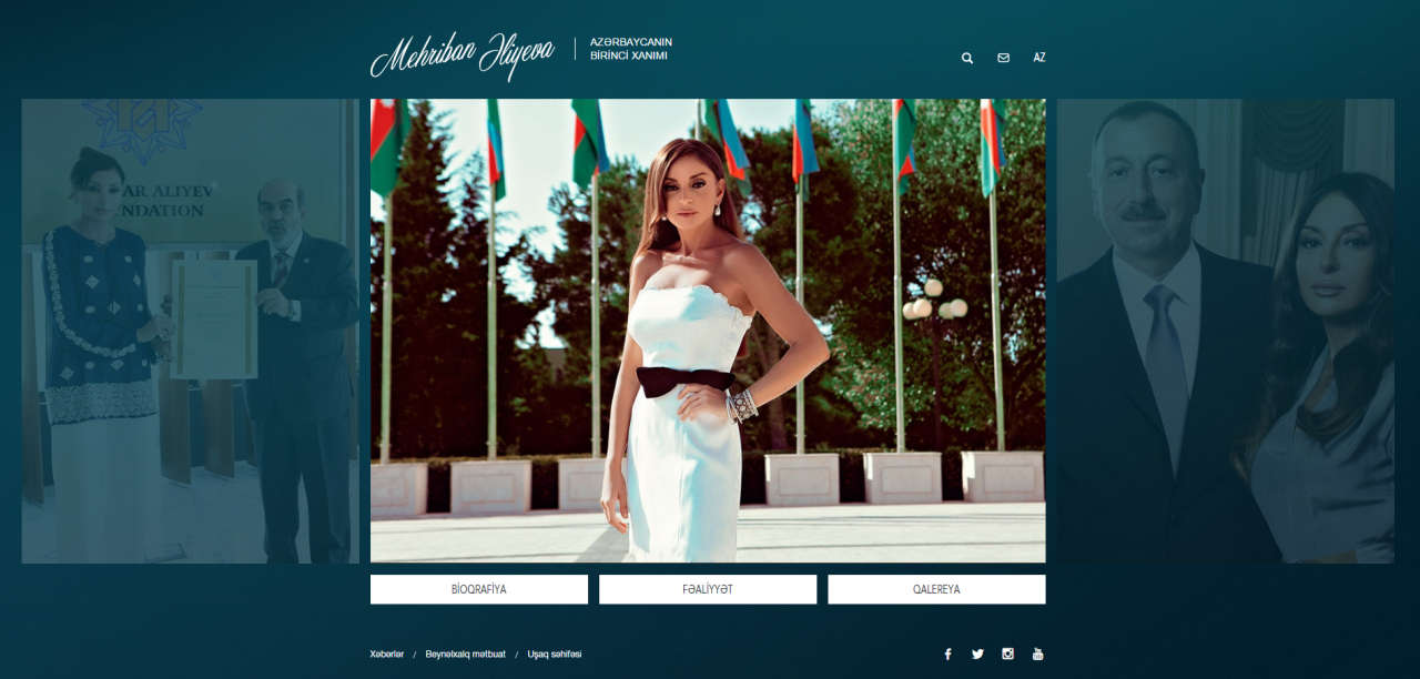 The homepage of the website includes “Biography”, “Activities”, "News" pages among others, offering the visitors speeches and interviews of Mehriban Aliyeva, devoted to her activities as a President of Heydar Aliyev Foundation and Azerbaijan Gymnastics Federation, Chairman of the Azerbaijani Culture Friends Foundation, MP, UNESCO and ISESCO Goodwill Ambassador, as well as a variety of information.
