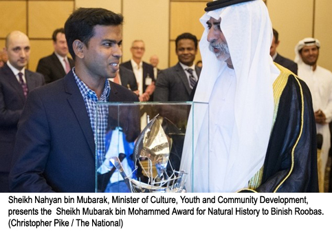 The winner of the 2016 Sheikh Mubarak bin Mohammed Prize for Natural History was Binish Roobas, a Dubai-based Indian zoologist, who has undertaken ground-breaking studies of the country's wildlife, including the first-ever study of the many species of spider to be found in the UAE.