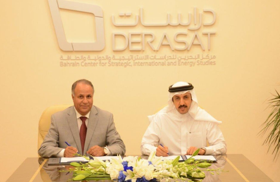 Manama, June 18 (BNA): Board of Trustees Chairman Dr. Shaikh Abdullah bin Ahmed Al Khalifa represented the Bahrain Strategic, International and Energy Studies Centre (DERASAT) and Professor Mohamed Benhamou represented the Moroccan Center for Strategic Studies in the signing ceremony of a research and scientific cooperation agreement.