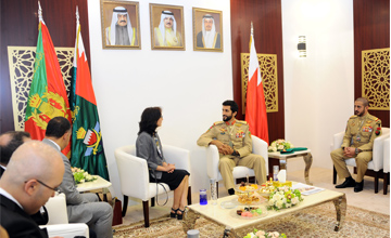 Manama, Oct. 18 (BNA): Commander of the Royal Guard, Chairman of the Supreme Organizing Committee of Bahrain International Defence Exhibition/Conference 2017 (BIDEC), HH Brigadier Shaikh Nasser bin Hamad Al Khalifa, in the presence of Commander of the Royal Guard's Special Force, HH Major Shaikh Khalid bin Hamad Al Khalifa, today received Turkey’s Ambassador to Bahrain Hatun Demirer and a Turkish military delegation. The Royal Guard Commander reviewed the latest military technologies showcased in the BUIDEC 2017. The delegation praised the event organisational level and the advanced defence equipment exhibited.