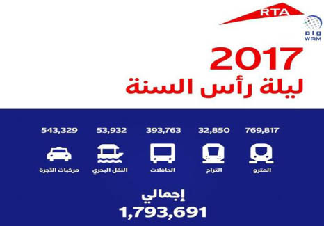 DUBAI, 2nd January, 2017 (WAM) -- The number of passengers riding public transit on New Year’s Eve 2017 in Dubai reached 1,793,691 riders, according to statistics released by the Roads and Transport Authority, RTA, .
