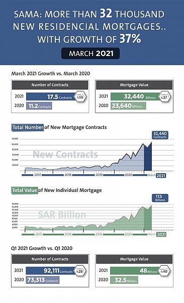 Riyadh, April 30, 2021, SPA -- The value of residential new mortgage loans for individuals registered 56% in a new historical performance with 17.5 billion in March 2021. The number of contracts jumped to 32,440 contracts with increase of 37%, comparing to March 2020, according to the monthly report issued by Saudi Central Bank "SAMA".