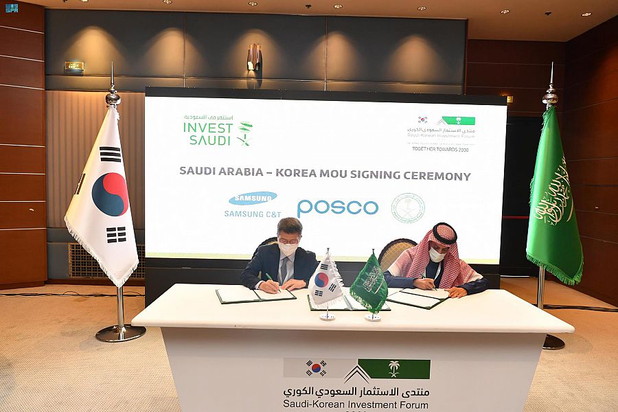 Riyadh, Jan. 19, 2022, SPA -- The Public Investment Fund (PIF) in Saudi Arabia, POSCO and Samsung C&T signed here today a tripartite memorandum of understanding aimed at developing a project to produce green hydrogen for export purposes. The event took place on the sidelines of the Saudi-Korean Investment Forum, which was held in Riyadh, during the visit of the President of the Republic of Korea to the Kingdom.