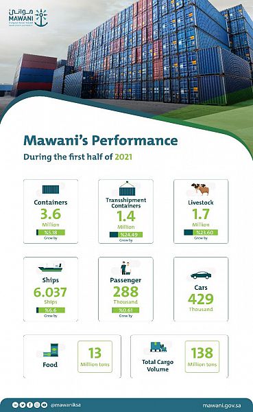 Riyadh, Aug. 04, 2021, SPA -- Saudi Ports Authority, "Mawani" recorded a staggering growth in its volumes during the first half of 2021. The number of containers handled reached 3.6 million TEUs, 5.18% ahead of last year, trans-shipment containers at 1.4 million TEUs, 24.49% higher than last year, while total cargo tons reached 138 million tons. According to statistics issued by Saudi Ports Authority, livestock witnessed accelerated growth reaching 1.7 million heads, 23.6% higher than to last year. Saudi Ports Authority recorded an increase in the number of ships received at 6,037, an increase of 6.6%, the number of passengers grew to 288,000 an increase of 0.61% than last year, while the number of imported cars handled reached 429 000 cars translating into 13 million tons. -- SPA
