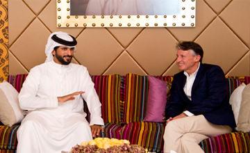 HH Shaikh Nasser expressed his support as he received IAAF President Lord Sebastian Newbold Coe in the presence of HH Shaikh Khalid bin Hamad Al Khalifa, First Deputy President of the Supreme Council for Youth & Sport, President of West Athletics Federation, President of Bahrain Athletics Association and Hesham bin Mohammed Al Jodar, Minister of Youth and Sports Affairs.