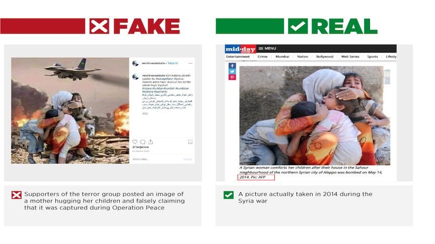For instance, supporters of the terror group posted an image of a mother hugging her children during the Syria war, a picture actually taken in 2014, falsely claiming that it was captured during Operation Peace Spring.