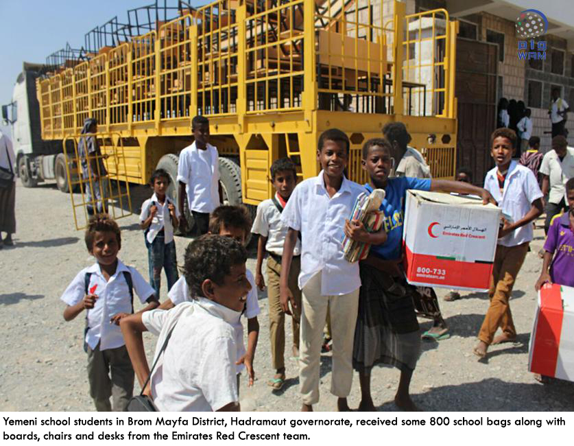 AL MUKALLA, 24th October, 2016 (WAM) -- Yemeni school students in Brom Mayfa District, Hadramaut governorate, received some 800 school bags along with boards, chairs and desks from the Emirates Red Crescent team in the first phase of a project to support education in the country. During the launch ceremony of the project, the head of administration of Brom Mayfa Salah Al Bas and the head of the district's education department Musallam Al Shammasi thanked the UAE humanitarian agency for supporting education in the coastal areas of the governorate. Head of the UAE relief team in Hadramaut Mattar Al Ketbi stressed that the agency seeks to ease the suffering of students and families affected by the situation in the country. The initiative, launched in early October, is part of intensive efforts to support all schools in Hadramaut, he noted. – Emirates News Agency, WAM - http://www.wam.ae/en/news/emirates/1395301689771.html