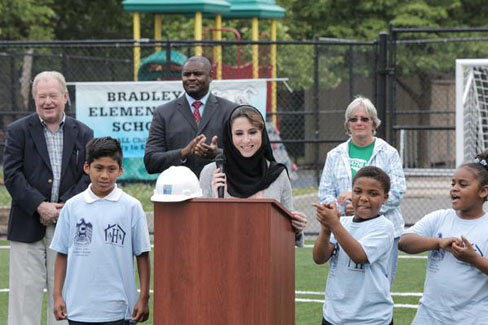 "We are delighted to be a part of this exciting gift to the kids of Bradley Elementary and the Asbury Park community," said Dana Al Marashi, Head of the Heritage and Social Affairs Department at the UAE Embassy. "Working with great local partners, the UAE Embassy has been committed to providing support and deepening involvement to help communities rebuild in the aftermath of Hurricane Sandy. We are proud of this second community soccer field in the state following the dedication of a field in Atlantic City last fall. We hope the kids of Asbury Park have fun using this field for many years to come."