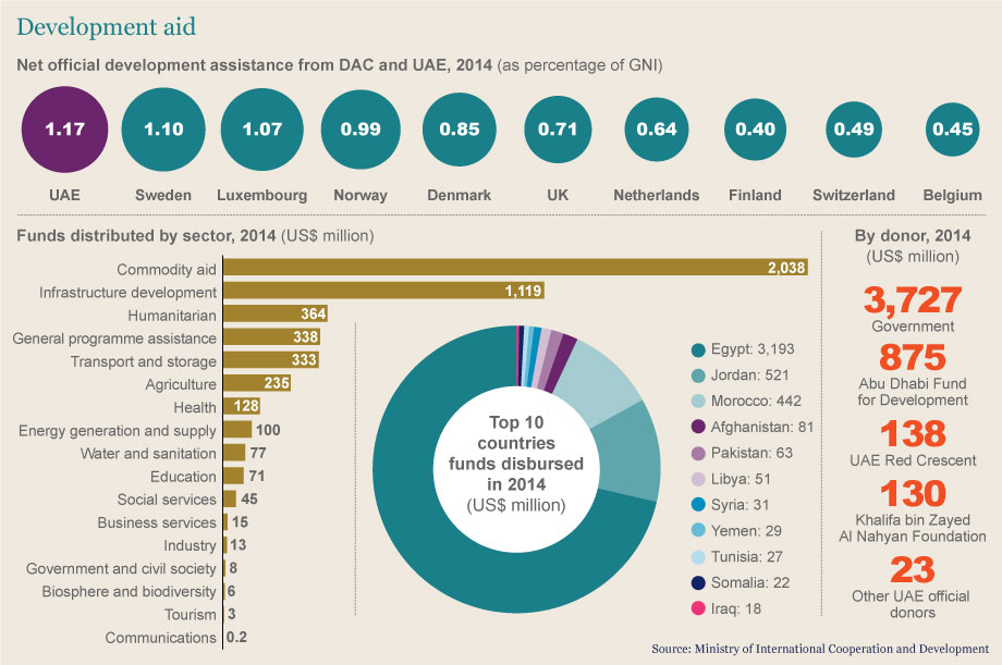 A press statement issued by the UAE Ministry of International and Cooperation Development, MICAD, said that the UAE gave Dh18 billion (US$4.89 billion) in 2014, equivalent to 1.17% of gross national income.