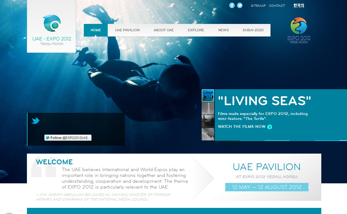 The website (http://www.expo2012uae.com) focuses on the core content of the UAE Pavilion and on the theme of EXPO 2012: Living Ocean and Coast.