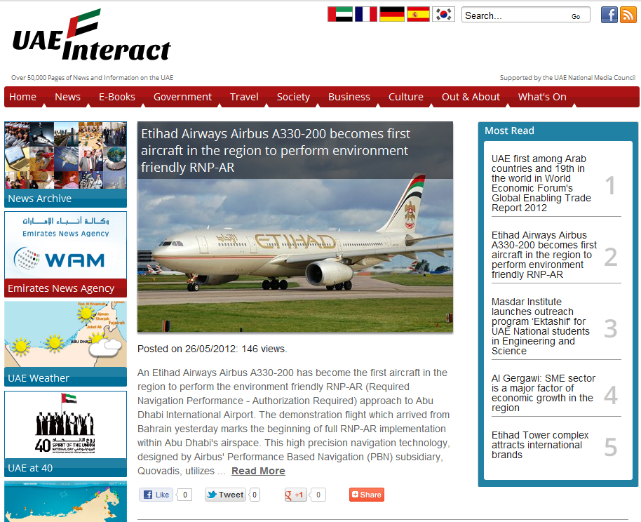 Abu Dhabi, May 27, 2012 (WAM) - uaeinteract.com, the news and information website operated in conjunction with the National Media Council, released yesterday its mobile device version that enables users to access readable text and images on their iPhones or other smart phones. The website, which has been online since 1995 and contains an archive of approximately 100,000 catalogued and searchable news stories on the UAE, recently underwent a major technical and design update aimed at enhancing user experience of the site. Direct linkage to Facebook and Twitter sites is complimented by improved statistical information, tracking most popular stories and an ‘easy reader' facility that automatically enlarges text for reference purposes. The website has one of the most comprehensive archives of news and information on the UAE with daily news-updates and links to numerous online resources. It also contains many short films on the UAE and is used as a reference, education and training resource by a wide range of public and private institutions. The main site is in English with connected sites in Arabic, French, German, Spanish and Korean languages.– Emirates News Agency, WAM
