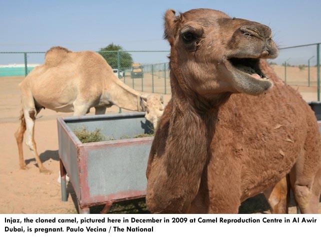DUBAI, 9th April, 2015 (WAM) -- Injaz, the world’s first cloned camel, celebrates her sixth birth yesterday and she’s pregnant, according to scientists at the Reproductive Biotechnology Centre in Nad Al Sheba, Dubai, who cloned the camel from ovarian cells in a breakthrough lauded by the world’s scientific community. According to The National daily, the scientists are also eagerly awaiting the birth of her calf, which was conceived naturally. Dr. Nisar Wani, scientific director of the centre, said that since Injaz was born, many cloned camels had been produced using skin cells, which has made the process easier. "We are very excited because Injaz is now pregnant and we expect to have a calf from her late this year," Dr. Wani said. "She has conceived in a natural way. This will prove cloned camels are fertile and can reproduce the same as naturally produced camels." The birth of Injaz created great excitement, with the New York scientific journal, Biology of Reproduction, carrying her picture on its cover. In 2010 Bin Soughan, the world’s first camel calf cloned from the skin cells of a bull, came into the world. The Reproductive Biotechnology Centre was established with the support of H.H Sheikh Hamdan bin Mohammed, Crown Prince of Dubai, and has a mandate to use biotechnology for the good of the region’s camels. – Emirates News Agency, WAM – http://www.wam.ae/en/news/emirates/1395279034375.html