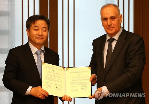 Yonhap News Agency CEO Park No-hwang and AZERTAC Director-General Aslan Aslanov signed the agreement at the Yonhap headquarters in Seoul, a day after the 39th Organization of Asia-Pacific News Agencies (OANA) Executive Board Meeting concluded its two-day run.