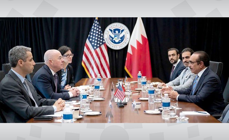 New York, June 10 (BNA): During his visit to the United States, Interior Minister General Shaikh Rashid bin Abdullah Al Khalifa met with the US Secretary of Homeland Security Alejandro Mayorkas. Ambassador of the Kingdom of Bahrain to the USA, Shaikh Abdullah bin Rashid Al Khalifa and the Interior Minister’s accompanying delegation attended.