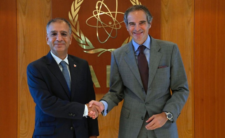 Dr. Bucheeri held a meeting with IAEA Director-General, Rafael Mariano Grossi, whom he congratulated on his re-election for a new four-year term. He also stressed the need to strengthen the Bahrain-IAEA relations in the field of peaceful use of nuclear technology and science. He also praised the tireless efforts exerted by the IAEA chief to strengthen the Agency’s role in promoting international cooperation for peace and development.