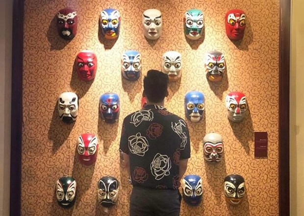 Hanoi, September 17 (VNS/VNA) - An art exhibition at the Vietnam Tuong Theatre in Hanoi offers art lovers and tourists a chance to learn about the art of tuong, or classical drama. Titled “Behind the Mask”, the exhibition also aims to raise local people’s awareness of and introduce foreign tourists to this unique traditional art form, a Vietnamese cultural gem that is gradually losing popularity in modern society. Though the facial make-up may be the most characteristic and outstanding feature of tuong, it is not everything. Behind the Mask invites audiences to look beyond the colours and strokes to find other distinctive aspects of this long-established performing art. With a history of around 800 years, tuong has steadily developed and enhanced its various aspects from make-up and costume to music. The Vietnam Tuong Theatre has been making significant contributions to preserving and developing this traditional art form. With the aim of offering visitors the chance to learn about this art form, the exhibition is divided into four sections. The ‘History Room’ on the ground floor provides a brief introduction to the long history of tuong. Alongside images of the art form’s founding figures, the venue also showcases some ancient tuong scripts written in Nom (an ancient Vietnamese ideographic script). The significant role of the Vietnam Tuong Theatre in the preservation of the art genre has been recognised by the State with the Labour Order, first class, and the Independence Order, first class. The theatre has also won several awards at national drama festivals including gold medals at the 2019 National Festival of Tuong and Folk Songs and 2012 Festival of Vietnamese Nationalities’ Traditional Music Instruments, and the A Prize at the 1996 Theatre Awards from the Vietnam Association of Theatre Artists. Right opposite the ‘History Room’ is a set of four collages by tuong painter Nguyen Hoang Phong. Using traditional materials like do (poonah) paper and bamboo blinds and shades, the collages depict patterns inspired by tuồng masks as well as geometric motifs from the bronze drums of the Bronze Age Dong Son Culture in ancient Vietnam. The make-up section showcases more than 30 hand-drawn masks portraying various characters in classical tuong plays such as Trieu Khuong Dan in the play Nu Tuong Dao Tam Xuan (Female General Dao Tam Xuan), and Khuong Linh Ta in Son Hau. Here the tour guide will reveal certain unique tuong make-up techniques you may not have known before. On the way to the upper floor, where the exhibition continues, visitors can see black-and-white photos depicting scenes from famous tuong plays performed by artists from the Vietnam Tuong Theatre. The upper floor has a display of performing costumes and musical instruments. Costumes from the folk play Ngheu So Oc Hen and the classical play Nu Tuong Dao Tam Xuan are placed opposite each other, allowing the audience to compare the differences between the two main genres of tuong. The juxtaposed section showcases musical instruments such as drum, clarinet, nhi (bowed two-string instrument), dan bau (monochord), and dan tranh (16-string zither), all commonly used in contemporary tuong performances. Also on this floor is a large altar to tuong ancestors where, before every performance, artists offer incense sticks to pray for a successful show. Behind the Mask, the first permanent exhibition of its kind, is part of a series of activities celebrating the Vietnam Tuong Theatre's 60th anniversary. The exhibition at 51A Duong Thanh Street, Hoan Kiem district, is open from 9am to 6pm every day, and entry is free. Free tours with guides are also available./.