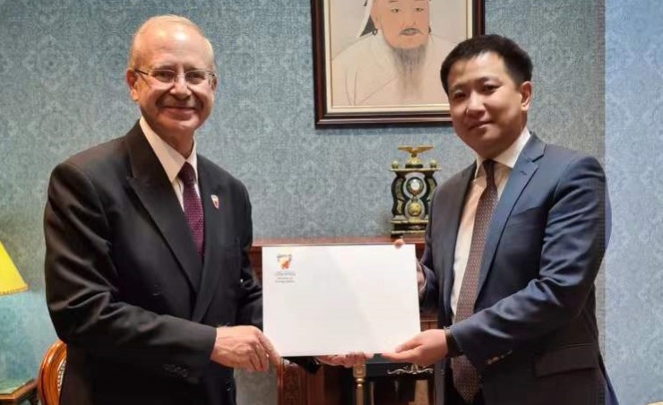 Manama, Mar. 26 (BNA): Mongolian Deputy Foreign Minister Amartuvshin Gombosuren received Ambassador Muhammad Ghassan Muhammad Adnan Sheikho, where he presented him with copy of credentials as Ambassador-Designate Extraordinary and Plenipotentiary of Bahrain to Mongolia, residing in Beijing.
