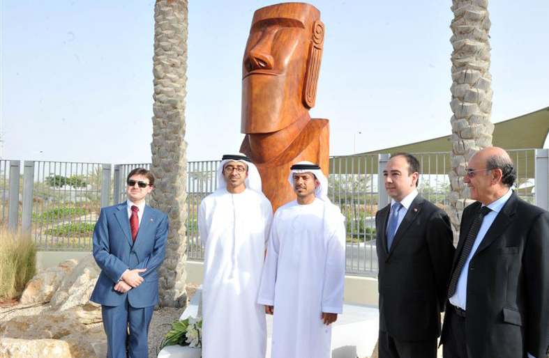 The gift is a 3.5 metre high wooden replica, weighing nearly 3 tons, of a Moai statue from Easter Island, (Rapa Nui), a remote Chilean-owned island over 3500 km off the coast of South America in the Pacific Ocean. The replica, which will be on permanent display in the outer garden of Manarat Sa’adiyat, was carved in the UAE from a single specially-imported wooden log by Rapa Nui artist Christian Tuki with the help of the architect Rodrigo Pumarino. A second replica will later go on display in Dubai.
