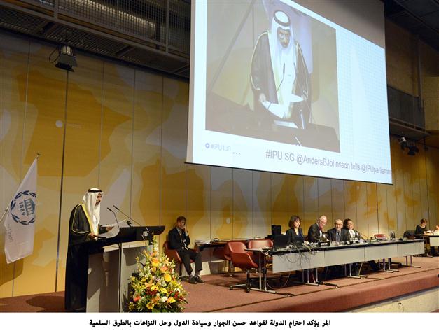 ''According to this principle, we issued our constant calls to resolve conflicts with Iran over its occupation of the three UAE Islands, Greater and Lesser Tunbs and Abu Musa through peaceful and negotiable means or international arbitration. This, in addition to keeping pace with the international developments and contributing effectively to international issues such as: renewable energy, climate change, protection of environment, combating diseases, inter-continental epidemics, humanitarian aid , human rights, women empowerment and paying attention to youth issues." Al Murr added During the participation of the UAE Parliamentary Division yesterday at the 130th Assembly of the Inter-Parliamentary Union, in Geneva, Al Murr, in a statement, pointed out that successes and achievements of the IPU have embodied the determination of the peoples of the world which emphasised that international peace and security represent the main message and target that we are working for and holding our joint conferences and activities.