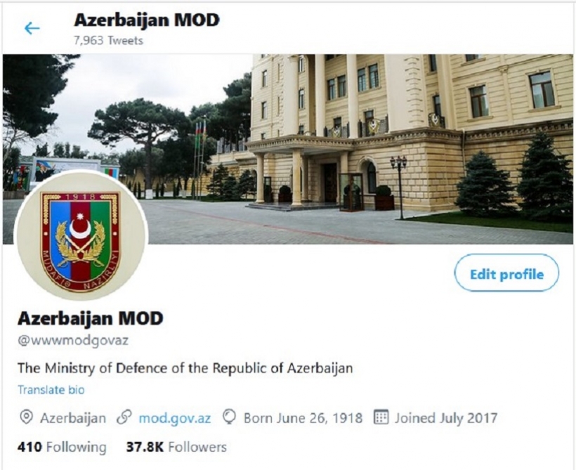 According to the press service, the official ‘twitter’ account of the Ministry of Defense of the Republic of Azerbaijan can be reached by the following link: https://twitter.com/wwwmodgovaz