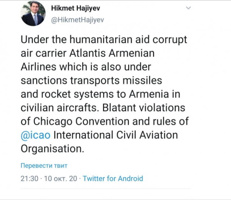 "Under the humanitarian aid, corrupt air carrier Atlantis Armenian Airlines, which is also under sanctions, transports missiles and rocket systems to Armenia on civilian aircrafts," Hikmat Hajiyev, Assistant to the President of Azerbaijan, Head of the Foreign Policy Affairs Department of the Presidential Administration, has twitted.