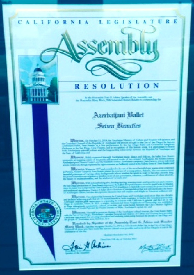 Azerbaijan’s Consulate General in Los Angeles told Trend that the resolution evaluates the staging of the ‘Seven Beauties’ ballet in San Diego as an important cultural event.