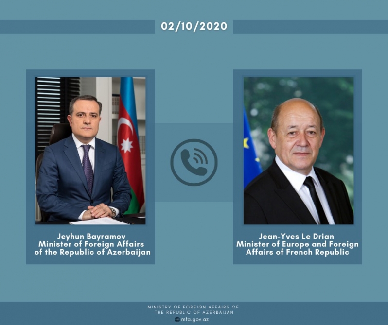 Baku, October 2, AZERTAC Azerbaijan`s Foreign Minister Jeyhun Bayramov has had a telephone conversation with Minister for Europe and Foreign Affairs of France Jean-Yves Le Drian. During the telephone conversation, Jean-Yves Le Drian expressed serious concern over the tensions in the region. He stressed the importance of decreasing tensions and respecting the ceasefire regime. In this regard, it has been referred to the statement of the heads of OSCE Minsk Group co-chair states. Minister Jeyhun Bayramov noted that the Azerbaijani Armed Forces carry out counter-offensive measures within its internationally recognized borders in response to the new military aggression of Armenia starting from 27 September, 2020. The FM brought to the attention the fact that the armed forces of Armenia continue to target the Azerbaijani civilians and civilian objects. Stressing that this is another gross violation of international humanitarian law by the occupying state, the minister noted that the shelling of the civilian population demonstrates the terrorist nature of the leadership of Armenia. Noting that tensions continue in the region, Bayramov emphasized that full responsibility for the current situation lies with the political and military leadership of Armenia.